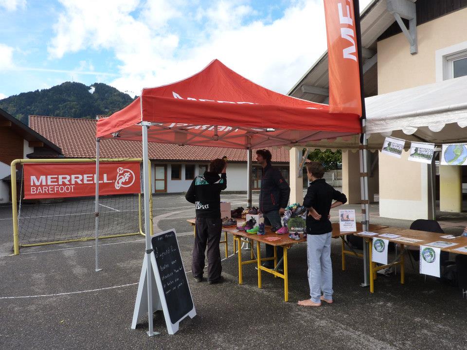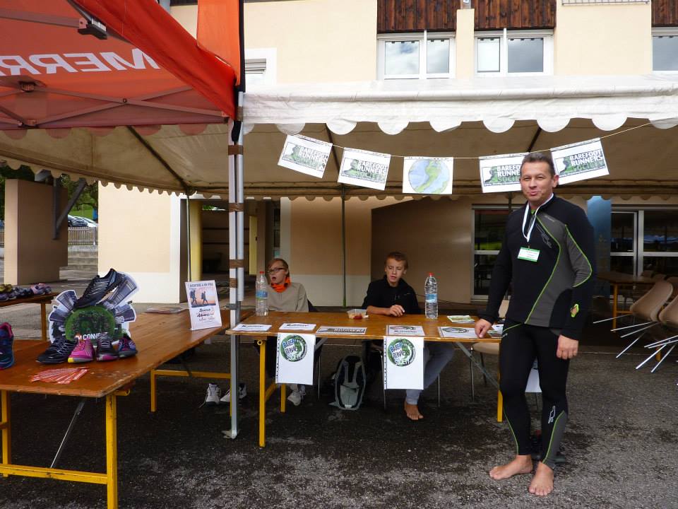 Pendant ce temps, au village, une animation barefooting permettant de découvrir la course pieds nus ou en chaussure minimaliste sur le parking aménagé a cet effet. Les deux stands, la BRS France et le stand de l’équipementier Merrell se côtoyait. Ainsi, les participants du trail, arrivés à bon port, en profitait pour passer une tête. Frédéric, animateur barefooting attitré, et Nils, le représentant Merrell, faisait équipe commune pour informer les curieux sur les spécificités néanmoins communes de la course allégée.
