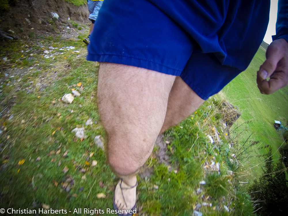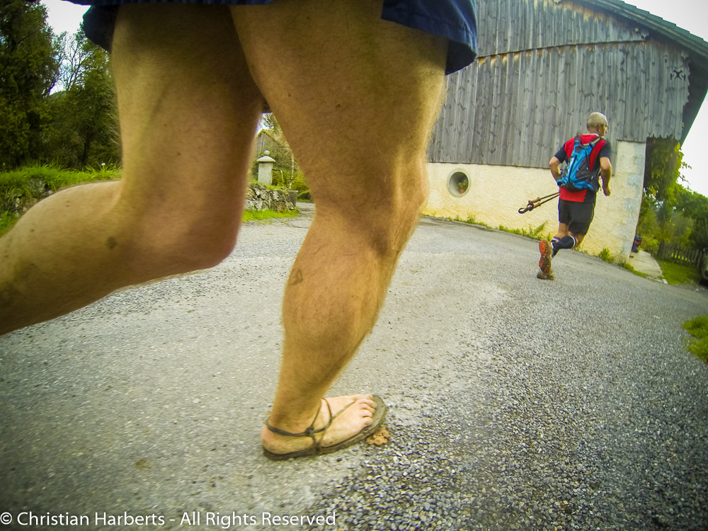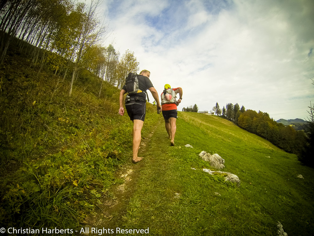 Toute suite à la sortie du village, virage à droit et on s’engouffre dans une série de passages quasiment en ligne droit à travers champs et forêts. Deux kilomètres à environ 25 pour cent, plus de 500 mètres de D+ ! Sans crampons, il faut poser un maximum de la semelle par terre, aidé par la grosse flexibilité des la matière Vibram Dunas 10mm qui permet d’atterrir sur même les pierres les plus tranchantes. Le « truc » c’est de trouver des appuis fiables dans les passages les plus raides, quand seul l’avant pied touche au sol. Heureusement je suis assez léger, et j’ai réussi à doubler pas mal de monde, tout en marchant…