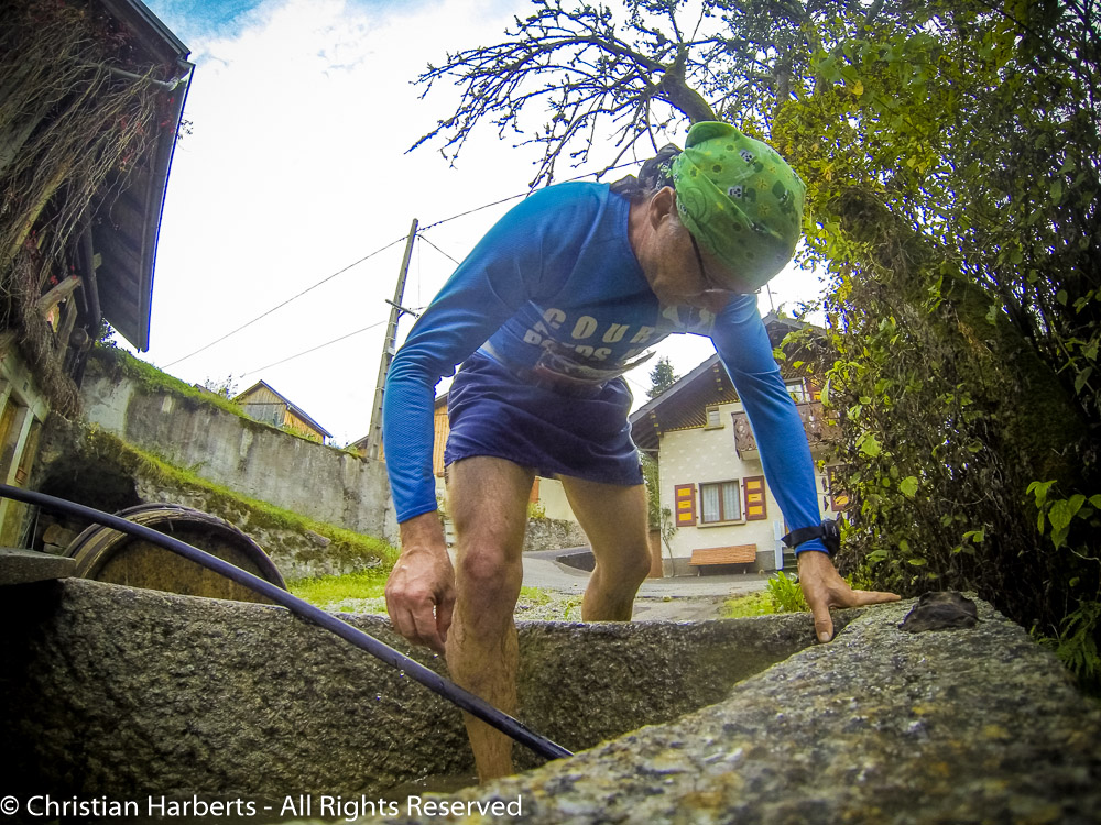 EcoTrail du Massif des Brasses 2014 – Un brin de toilette aux Jourdillets pour faire disparaître les traces du dérapage dans l’herbe dans la descente 😉