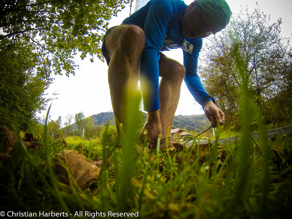 EcoTrail du Massif des Brasses 2014 – Pause technique pour resserrer les lacets de la sandale gauche, en cuir, ça se détend quand c’est mouillé, puis ça ballote – m’énerve !