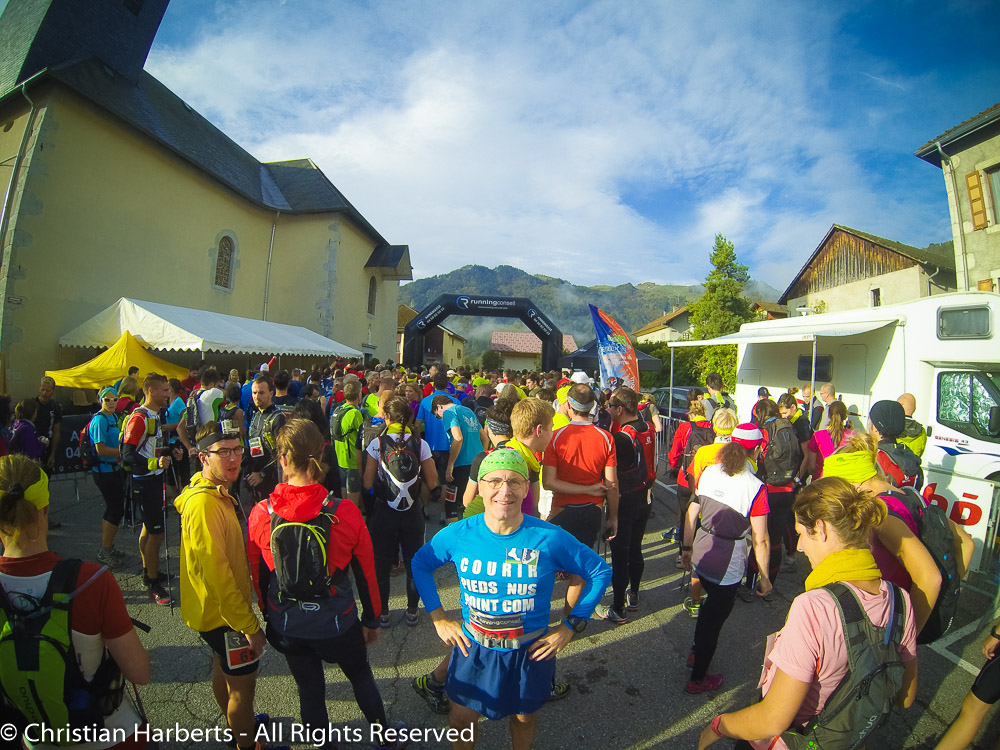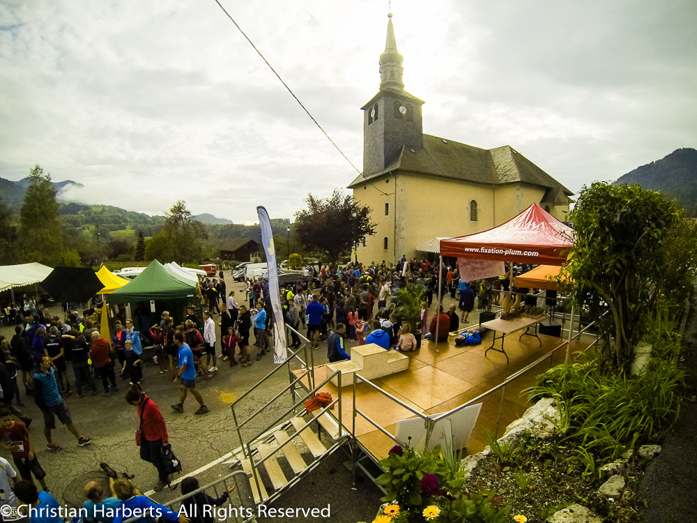 EcoTrail du Massif des Brasses 2014 – Village de ‘ETMB, place du village d’Onnion.