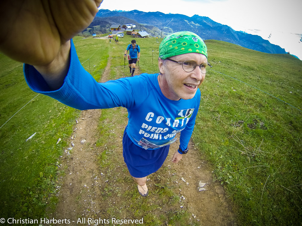 Arrivé en haut, j’ai pas eu envie de redescendre tout suite, plutôt prendre quelques photos avec la GoPro et son trépied, trimbalé depuis le départ. J’ai pris congé de mes co-aventuriers, bavardé un peu avec les bénévoles stationnés à ce point de retour situé nul part. Mais quelle vue !! J’avais pas consacré beaucoup de temps à regarder le paysage – autant en profiter maintenant, car je sentais que le retour allait mobiliser toute mon attention…
