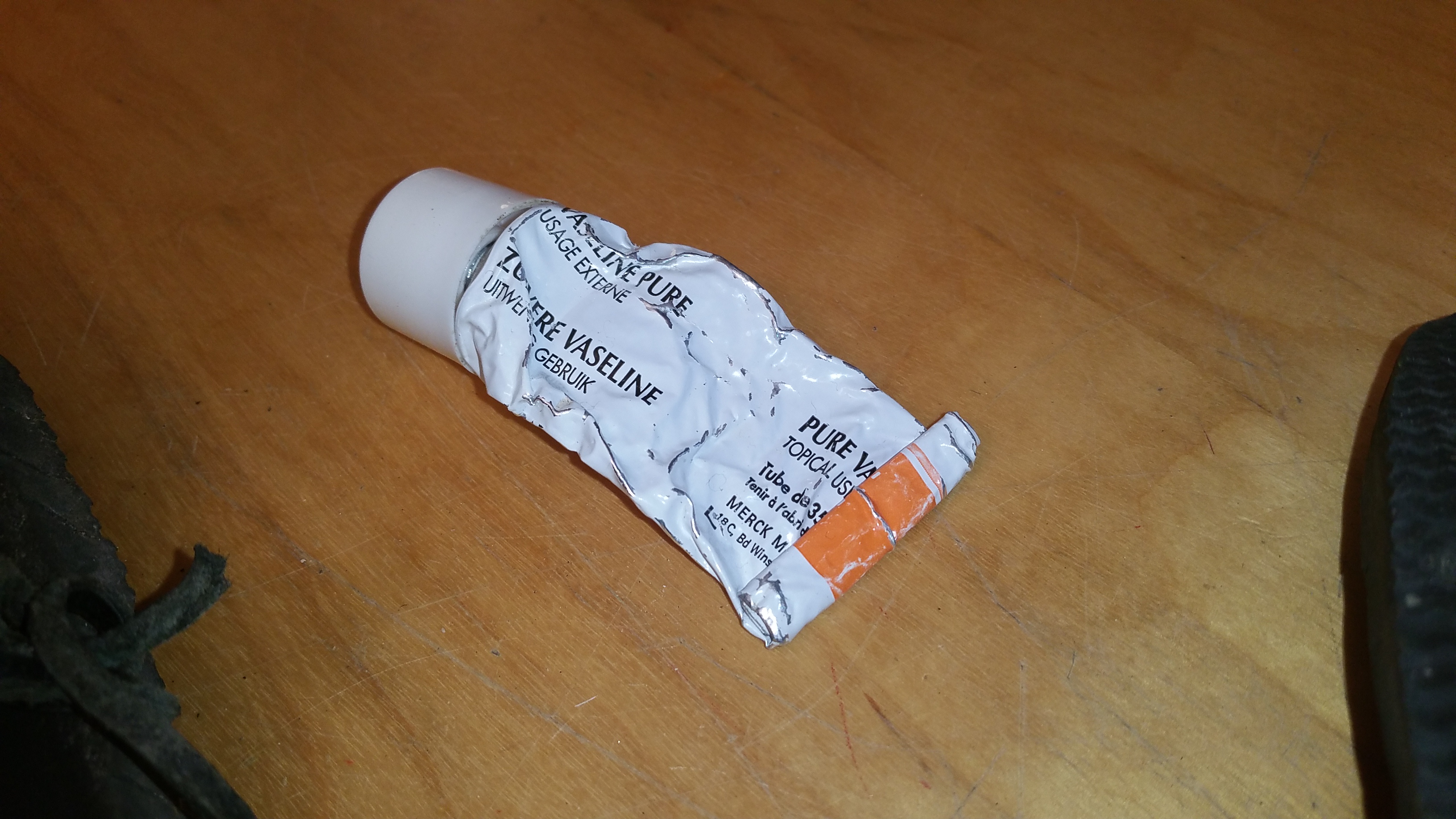 - Lubrification des points stratégiques – entre les orteils, sur le haut du pied (arche) et sur le bord extérieur, sous la malléole. A la fois de la vaseline sur la peau, et sur la lanière.