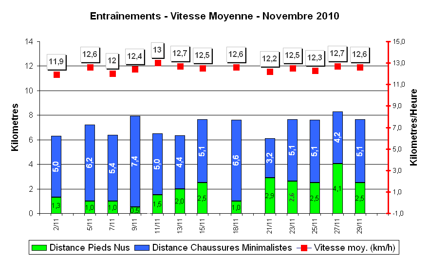 Distance moyenne parcourue : 6,5Km; Distance moyenne sans chaussure : 1,2 Km; Vitesse moyenne : 12,12 Km/H; durée moyenne de sortie : 32:25 minutes.